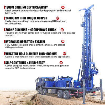 একটি শক্তিশালী 8x4 SINOTRUCK HOWO চেসিসে মাউন্ট করা একটি Cummins 360HP ডিজেল ইঞ্জিন সমন্বিত, CSD1300 চ্যালেঞ্জিং ভূখণ্ড এবং দীর্ঘ-দূরত্বের স্থায়িত্বের জন্য বিশেষভাবে তৈরি করা হয়েছে। প্রত্যন্ত গ্রাম থেকে শিল্প নির্মাণ অঞ্চল পর্যন্ত, এই রিগটি যেকোনো সাইটকে সম্পূর্ণরূপে সজ্জিত, স্ব-নিহিত ড্রিলিং স্টেশনে রূপান্তরিত করে - জেনারেটর সেটআপ, জলবাহী-নিয়ন্ত্রিত টাওয়ার, উইঞ্চ এবং একটি BW1500/12 উচ্চ-চাপের কাদা পাম্প সহ সম্পূর্ণ।